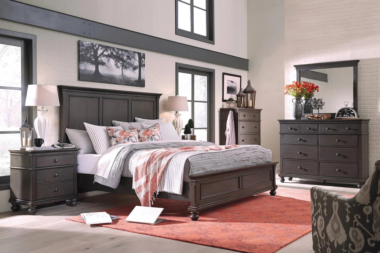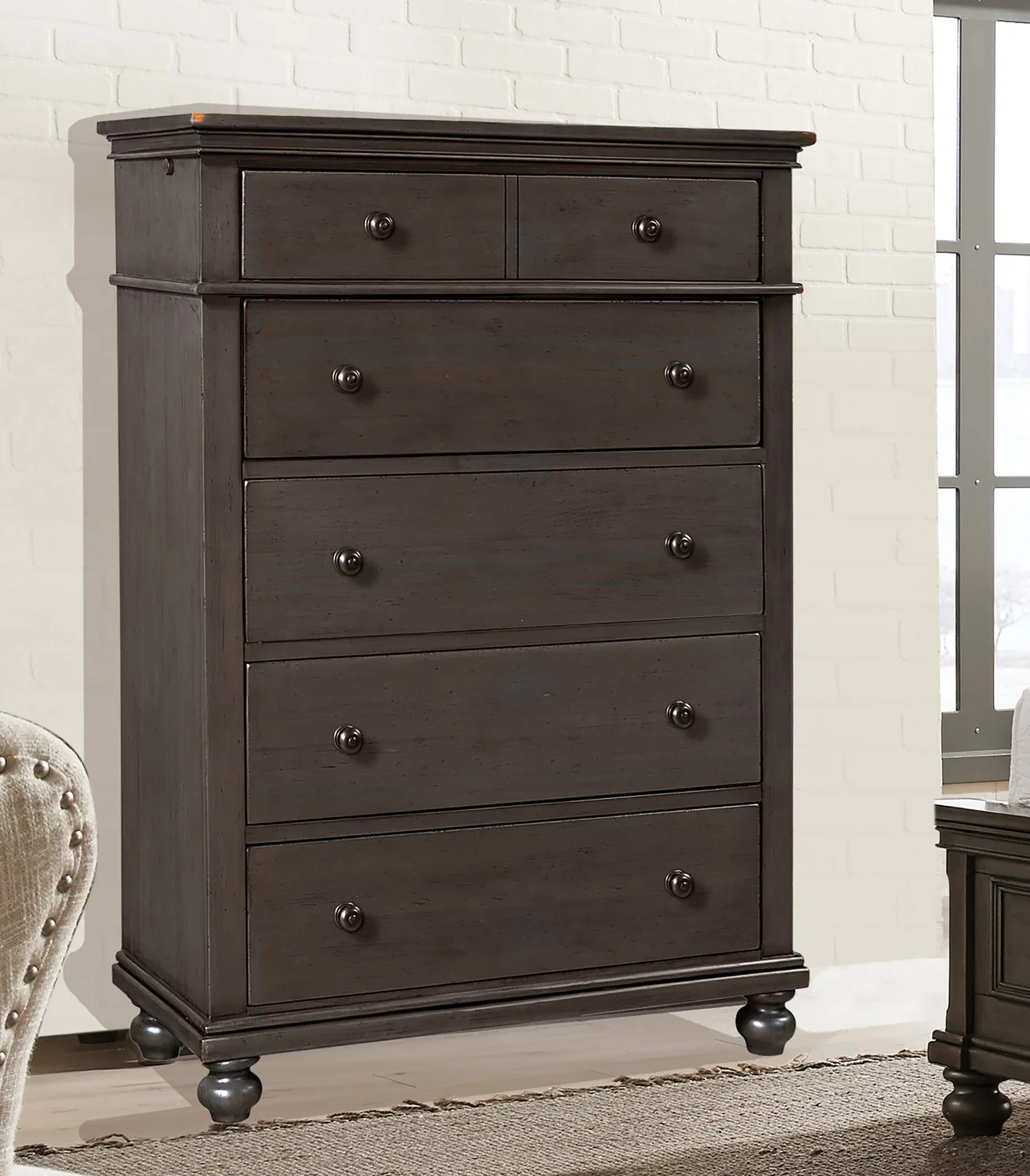 moreThis traditional 5-drawer chest is a timeless addition to any bedroom, offering ample storage and thoughtful features to keep your belongings organized and protected. The chest's peppercorn finish and gunmetal hardware bring a touch of sophistication to its classic design.
